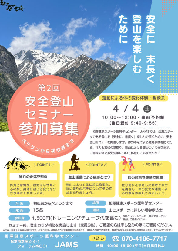 4月4日(土)開催!春山シーズンに向けた「安全登山セミナー」参加者募集 uematsu_pr2026-03-16T14:13:12+09:002026年03月16日|お知らせ, 相澤健康スポーツ医科学センター| FacebookTwitter電子メール